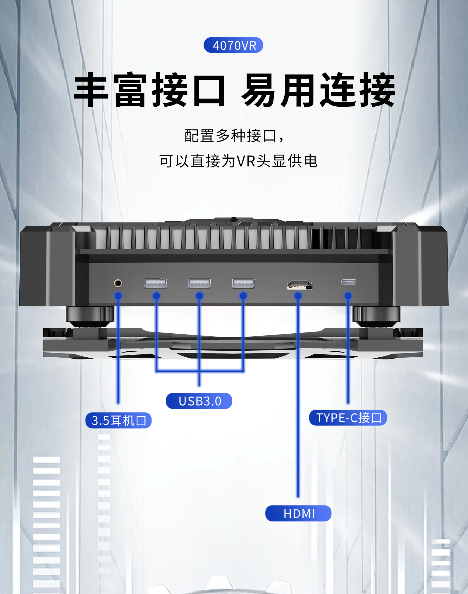 接口;USB 3.2 Tyep * 3, USB 3.2Type C *1, HDMI 2.1*1,12V/2.0A DC out,3.5mm耳機*1